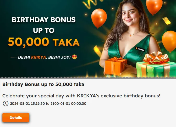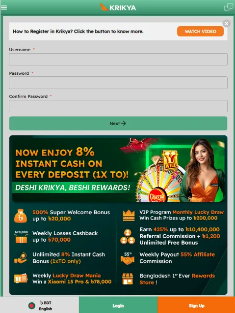 Enter promo code KRIKYABDDWIN during registration to unlock the enhanced casino bonus up to BDT 20,000.